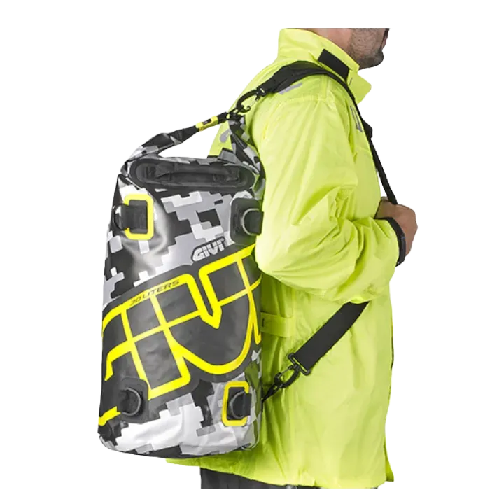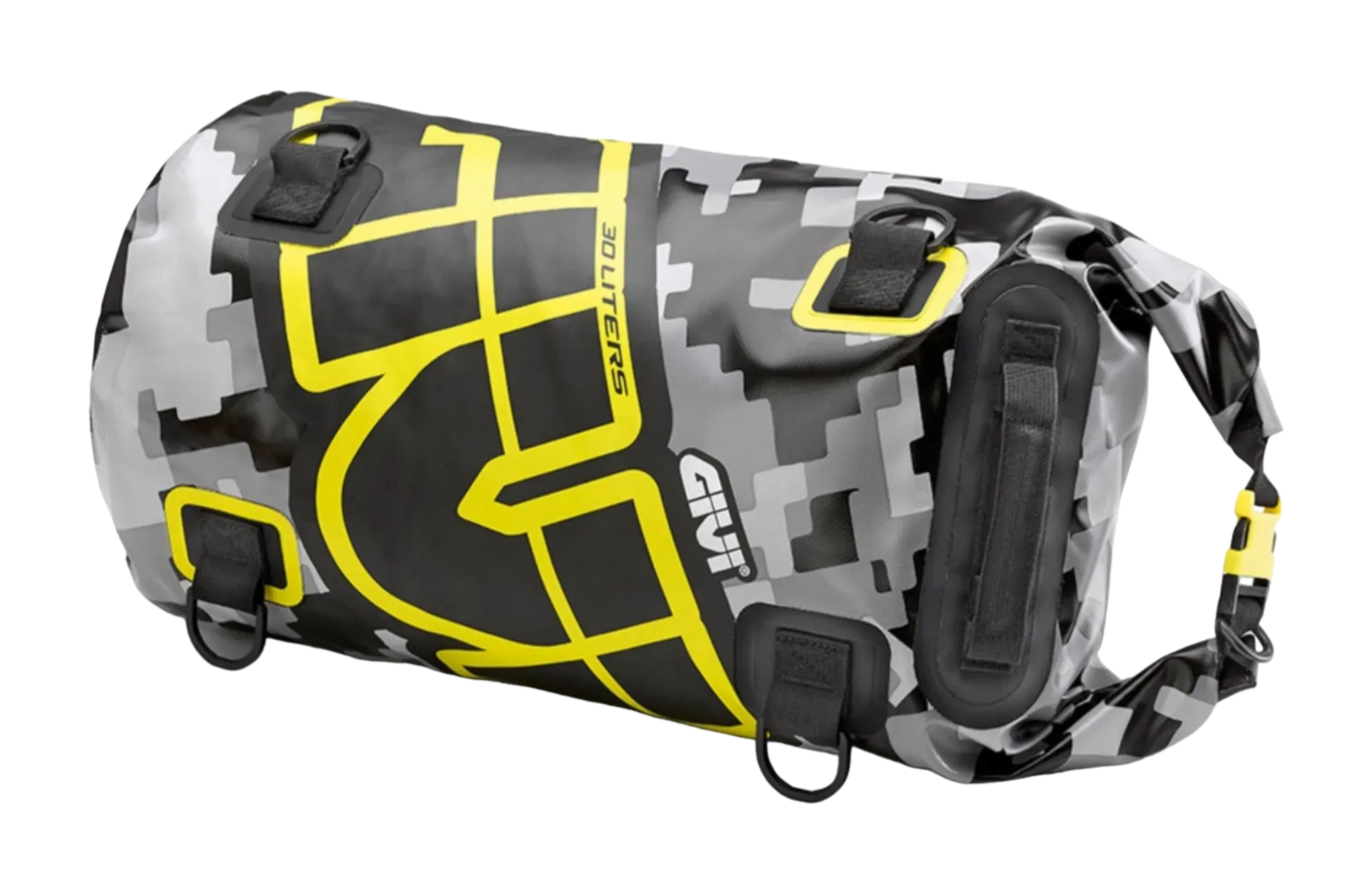 Bolsa cilíndrica impermeable para sillín o portapaquetes, 30 L., con gráfica camuflaje gris y amarillo.