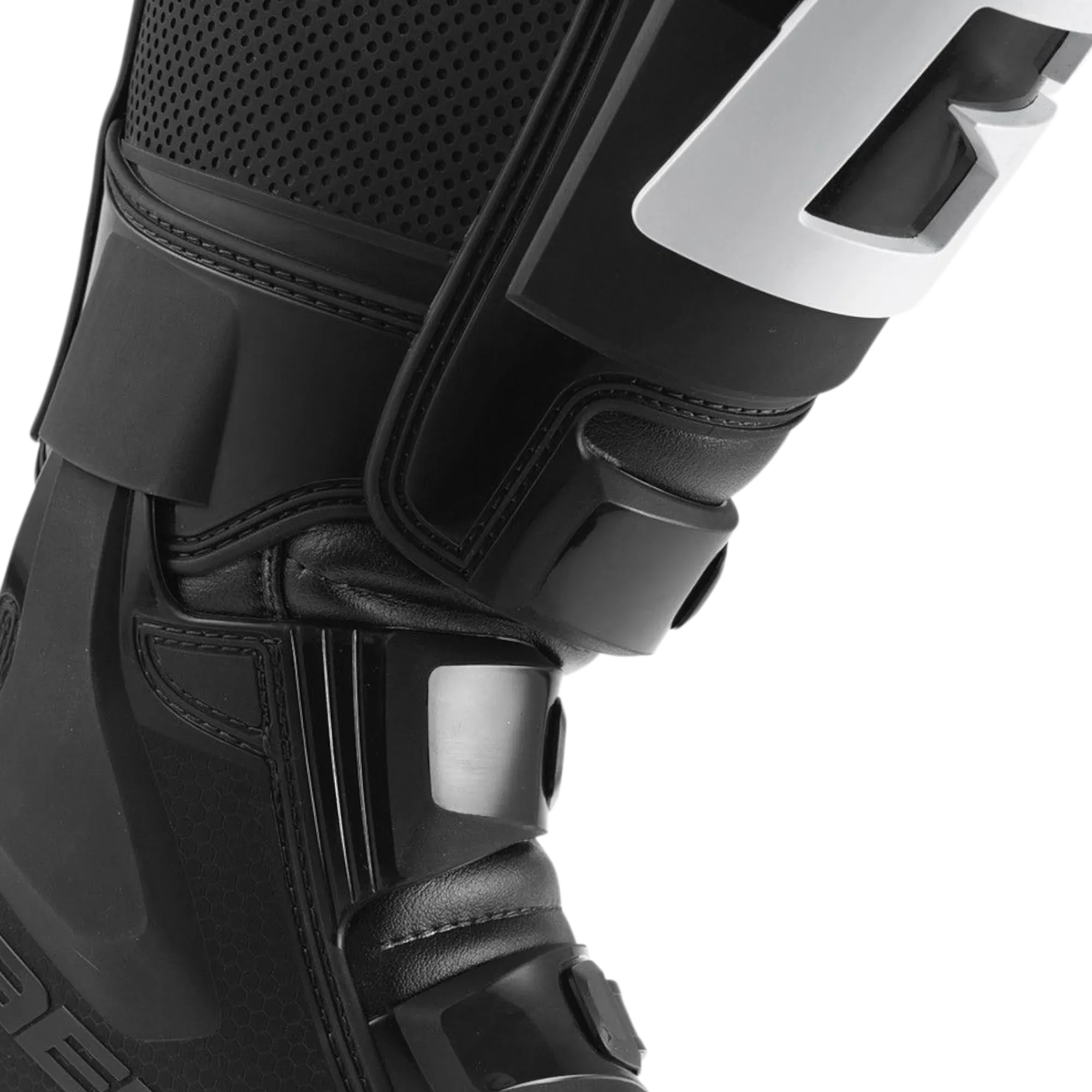 Espinillera delantera inyectada en PU con forma anatómica para una sujeción robusta; las ven...