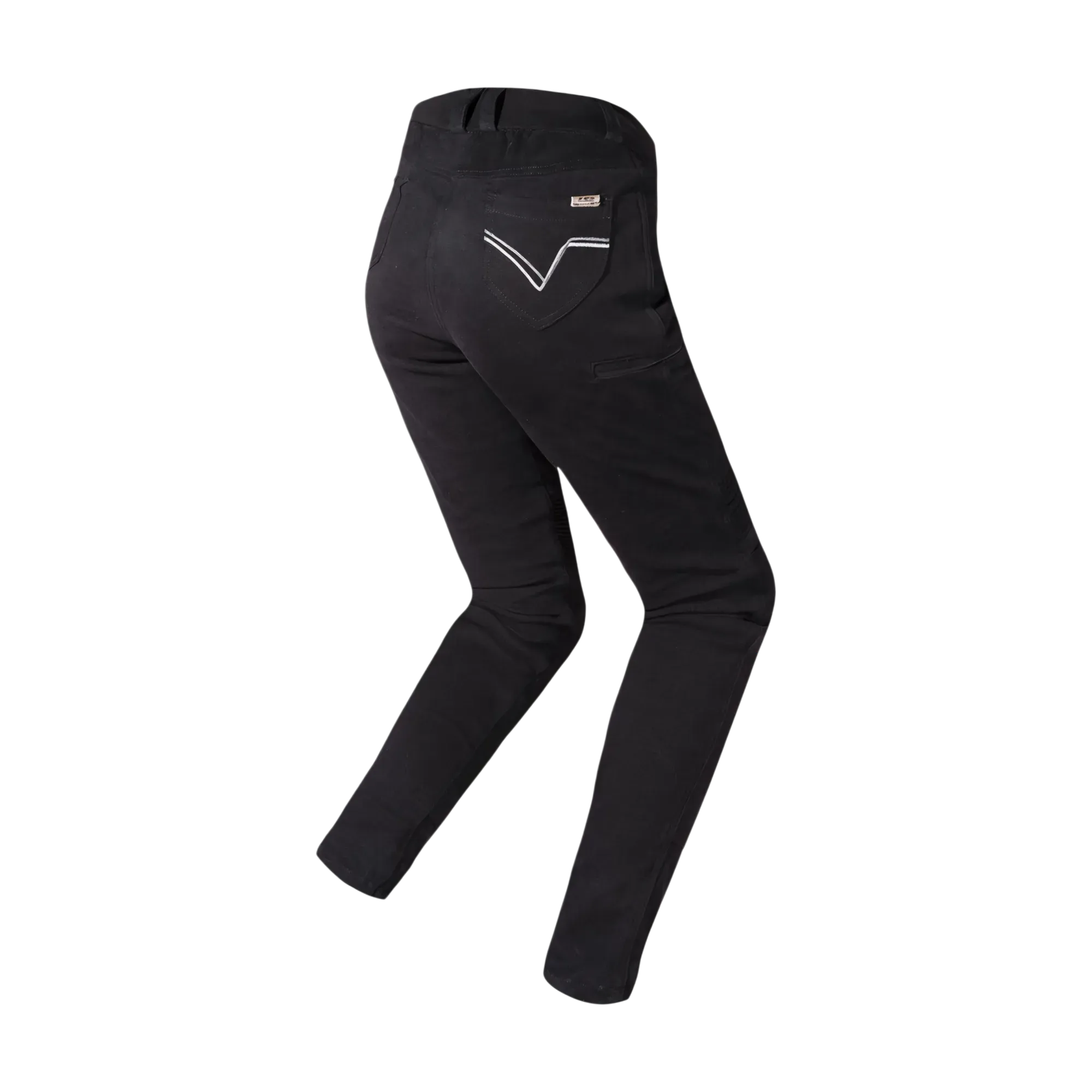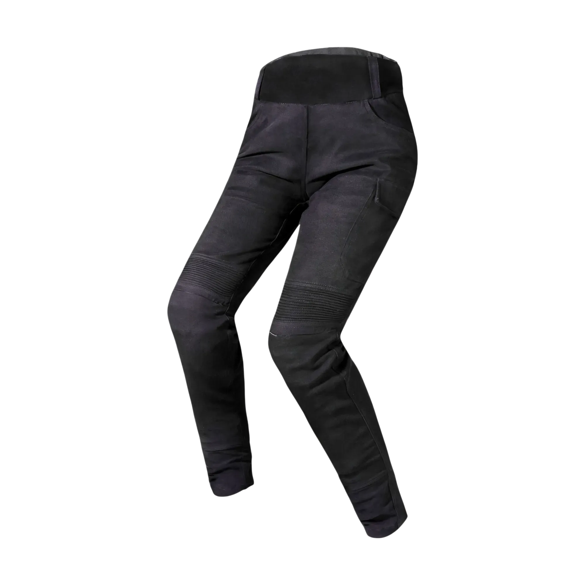Pantalones elásticos y muy resistentes de mujer con refuerzos de Kevlar. 6 bolsillos cómodos. Protecciones ajustables en las rodillas.